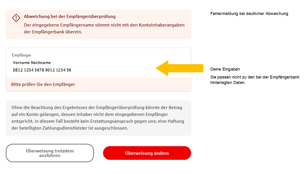 - Abweichung/nahezu Übereinstimmung: Der Name stimmt nicht exakt mit dem des Empfängers überein (weil du z. B. den Vornamen abgekürzt hast). Die Bank zeigt dir die Abweichung an und fragt, ob du die Zahlung trotzdem ausführen möchtest. Oft gibt es die Möglichkeit, den Namen zu korrigieren oder die Eingabe zu überprüfen.